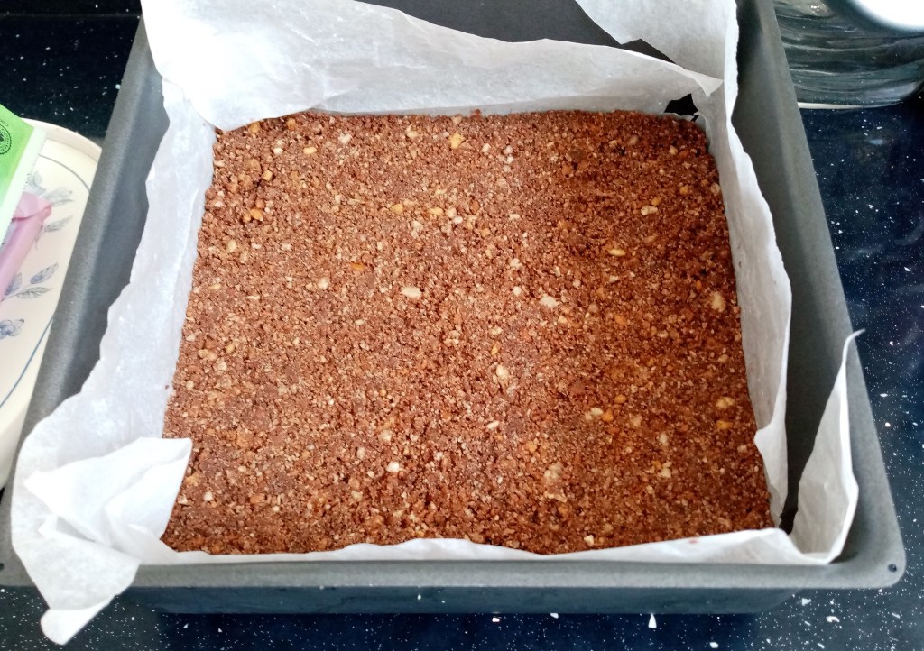 3. Push the mixture firmly into the lined tin and smooth the surface. Place in the fridge while you make the brownie mixture.