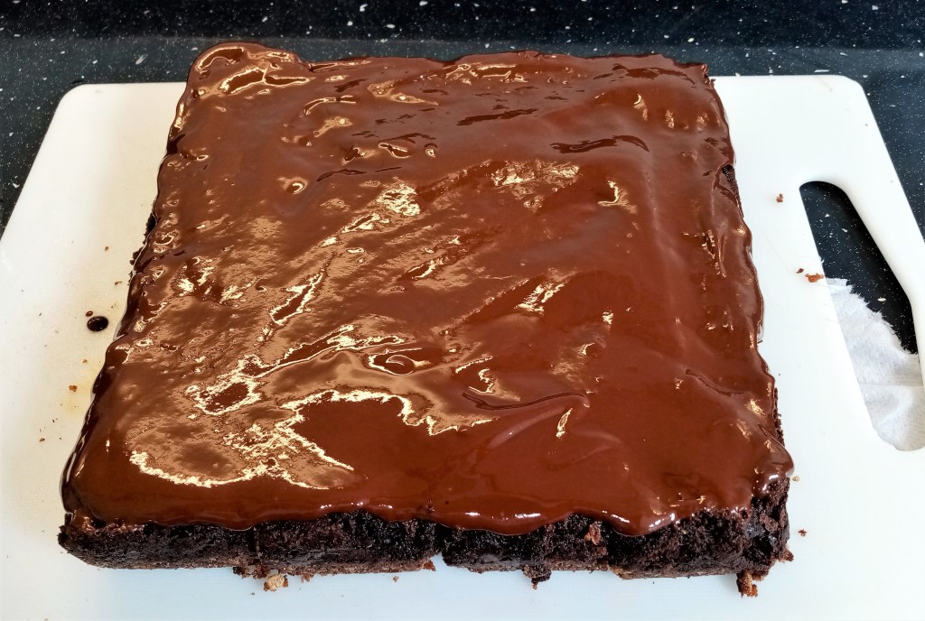 8. For the topping, melt together the chocolate and butter then pour or brush it over the brownie slab. (If you prefer, you could cut the slab into 16 squares first.)