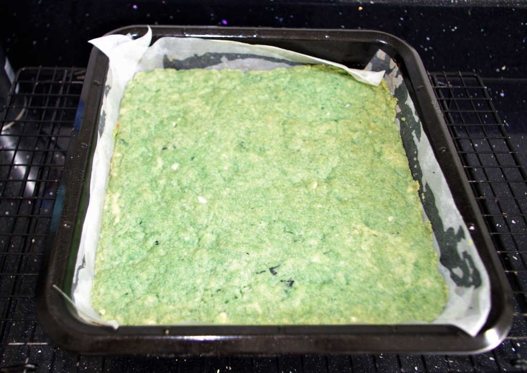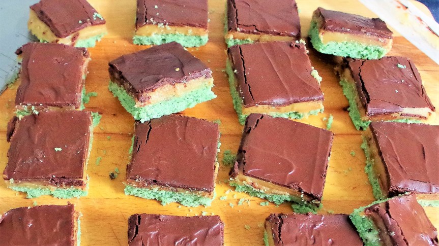 5. As it cools, make the caramel layer. Place the light brown sugar, butter, condensed milk and golden syrup in a large saucepan and heat gently, stirring until the butter has melted. Stir in the peppermint extract a little at a time, tasting as you go. Once you’re happy with the taste, turn up the heat and simmer for 10 – 12 minutes, stirring all the time, until the mixture is thick and becoming firm.