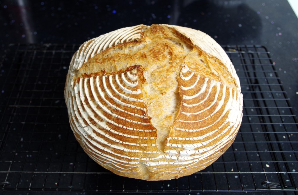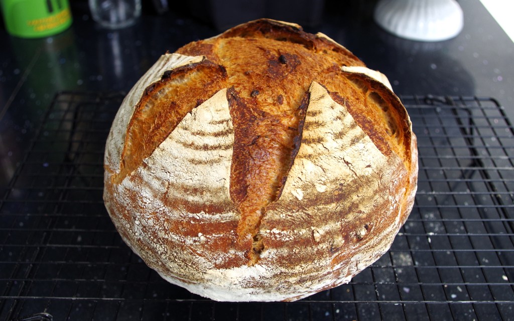 This is the sourdough recipe/method that I’ve been using most weeks for several years. It produces a very tasty medium sized round loaf with a crunchy crust (exterior) and a soft but firm crumb (interior). There are other methods, probably some better methods, but this one works well for me and should work for you too.