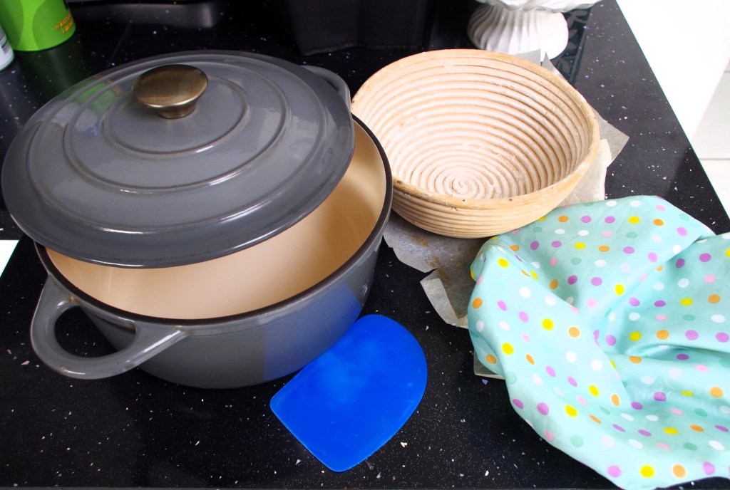 Need: A stand mixer is really useful, but not absolutely essential. Likewise, a banneton and a Dutch oven. An elasticated shower cap is useful, not essential, but quite pretty.