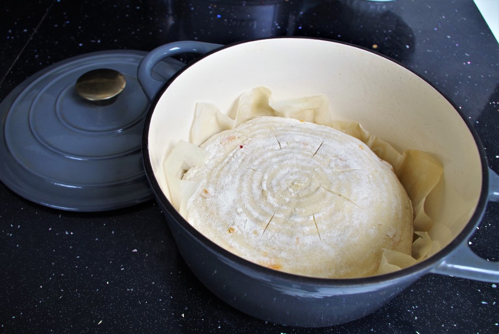 12. Put the lid on the Dutch oven then place it in a COLD main oven. Turn the oven on to Fan 210°C and bake for 50 minutes. Then take the lid off the Dutch oven and bake for a further 10 – 12 minutes.