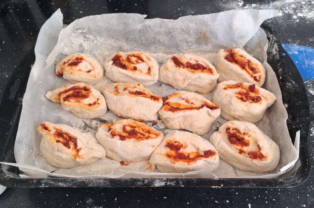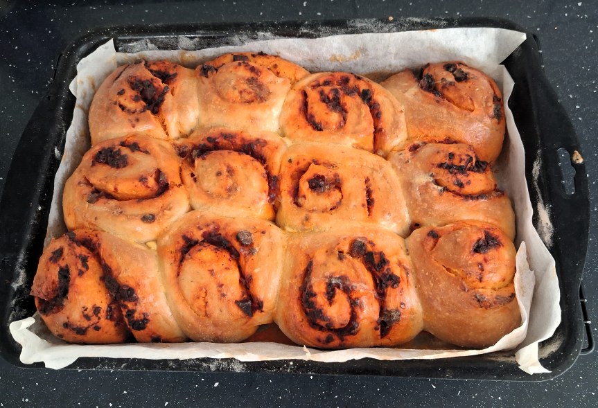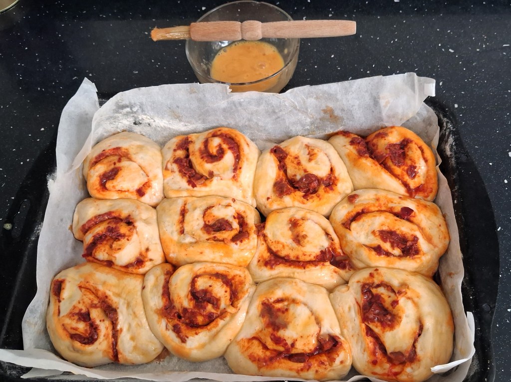 9. When the buns have risen again give them a brush with beaten egg and place in the oven. (I didn’t cover the top with foil, so any chorizo protruding became crispy – AKA burnt! I don’t mind a bit of carbon so it wasn’t a problem, but if you want to avoid this, put a sheet of foil over the tray at some point.