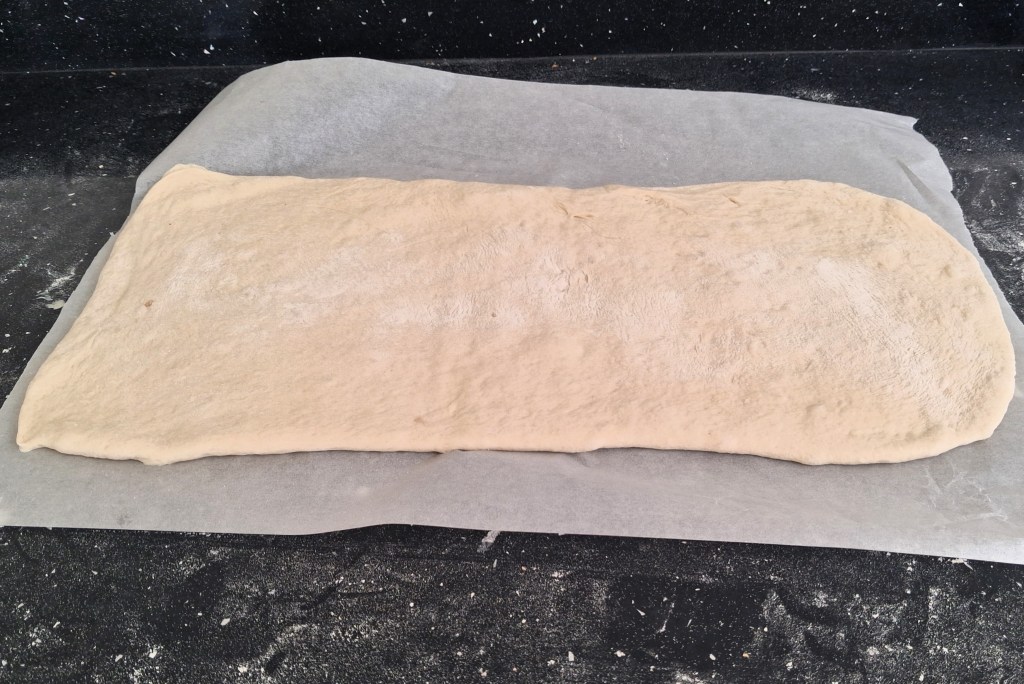 2. Knock back risen dough and flatten, then roll out into an oblong roughly 15” x 10”.