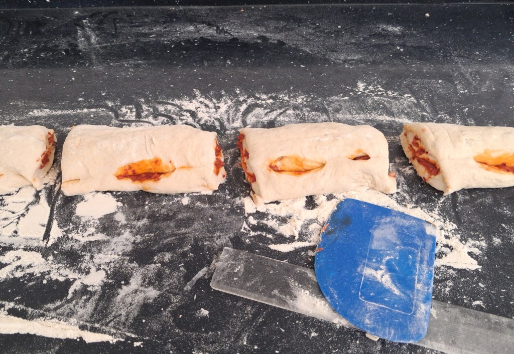 4. Fold/roll over the long ends. Make a tight roll. Cut into half then quarters then cut three from each quarter to make twelve.