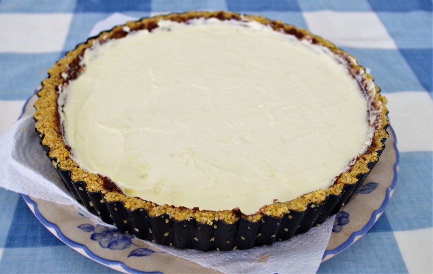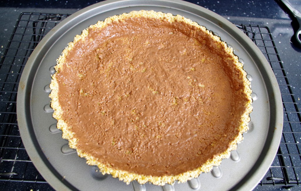 2. Bake the base for 15 minutes. (NB It will rise up so, either blind bake it, or bake it as it is and carefully press down the risen material with a wooden spoon.) Set aside to cool.