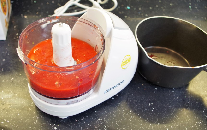 7. For the top layer whizz*** the strawberries to a puree. I didn’t bother sieving the puree, but you can. Put the puree in a small saucepan with either the corn flour or xanthan gum powder. Bring to a boil then simmer for a few minutes to reduce the liquid. Allow to cool. (***I used a mini-blender, but a stick blender would probably do as well.)