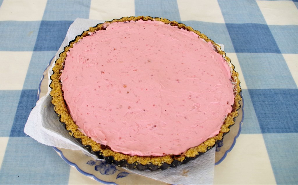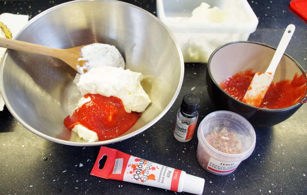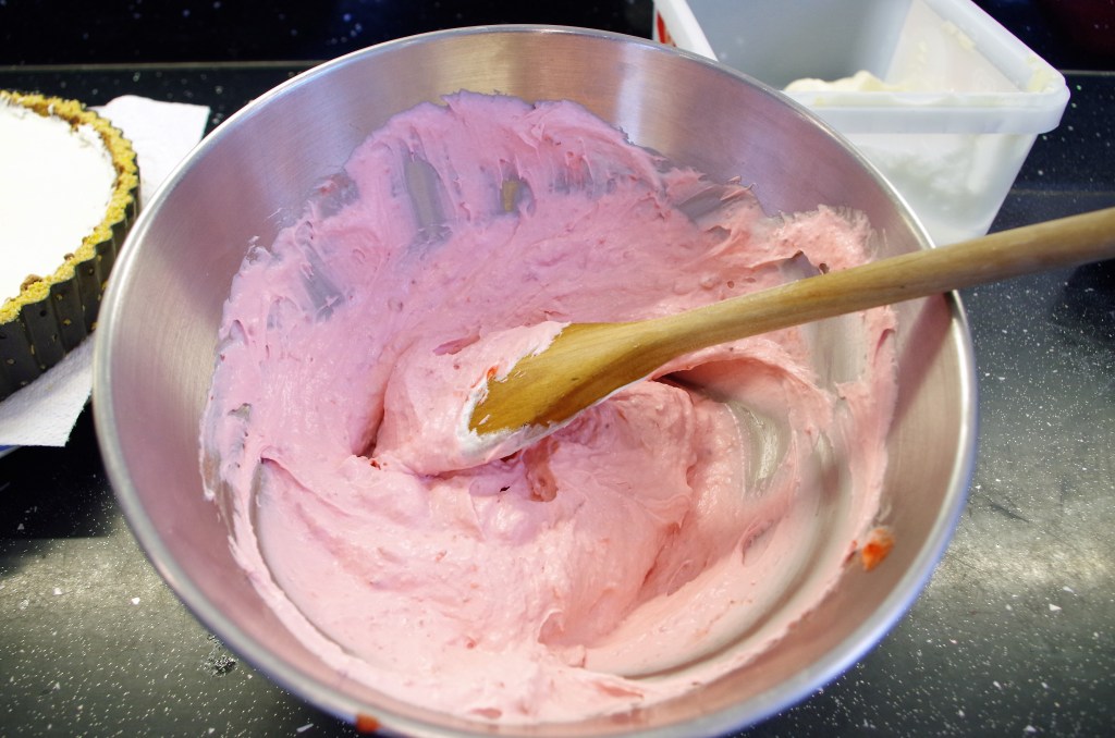 8. Mix the cooled strawberry puree into the remaining bowl of cheesecake mixture. If you need to boost the colour, mix in a small amount of red food colouring. The flavouring and freeze dried strawberries can be added here too if you choose to use them. Pour or spoon the mixture onto the mid-layer and return the cheesecake to the fridge for another 30 – 60 minutes.