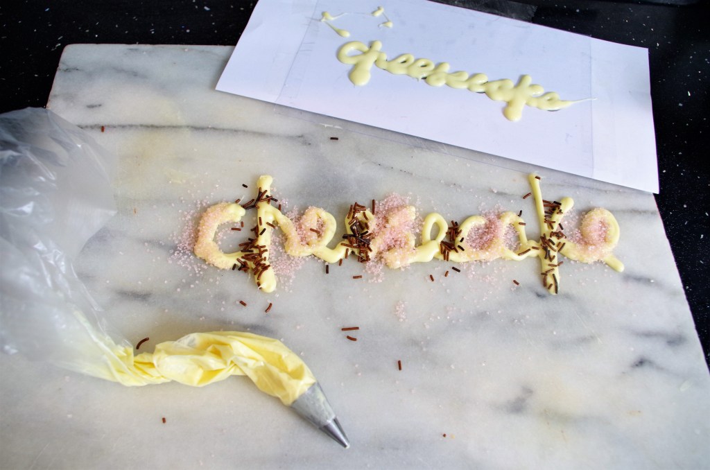 And here’s something that went wrong. I couldn’t release my decorated “Cheesecake” lettering from the marble slab without it breaking up. I had to use my smaller, practice, version. The lesson I leant was – use acetate.