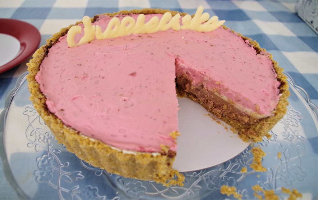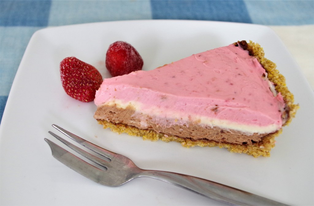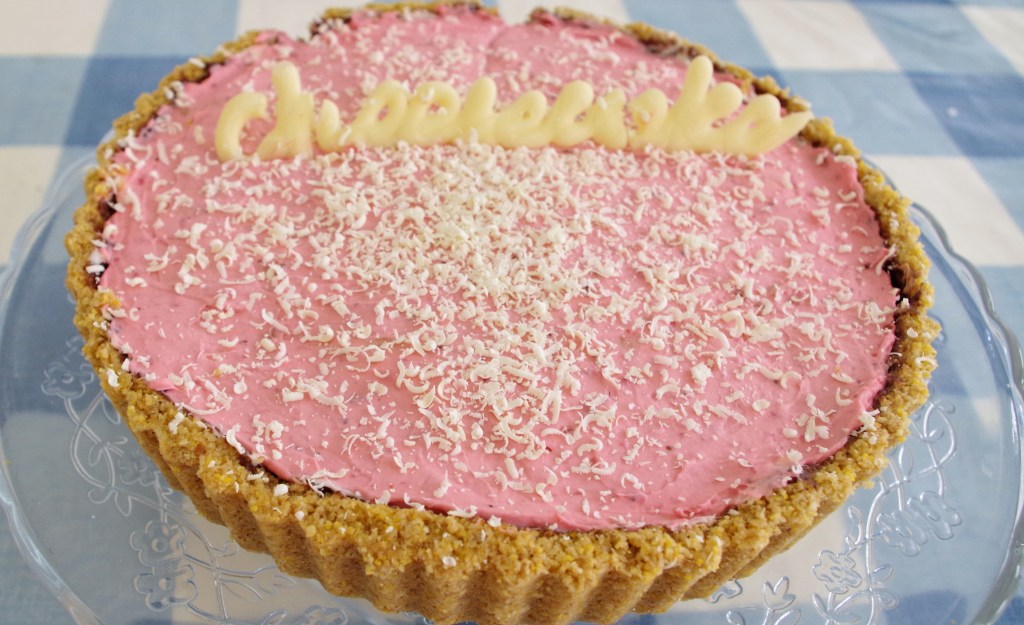 Within the crunchy crust are three luscious layers – chocolate, vanilla and strawberry – making this tart a terrific treat or a perfect pud. It could be gluten free or not, equally readily. The filling doesn’t need baking, so it’s quick and easy, but it does need to sit in the fridge a few times (which leaves you free to go and do other important things, of course.)