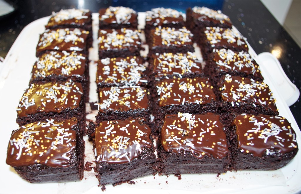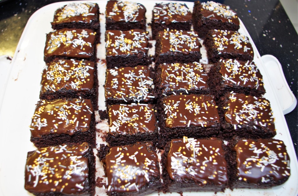 7. Spread the mixture over the baked block then add sprinkles or sweets. Leave to firm up then cut with a sharp serrated knife. (A warm wet knife gives a clean cut and helps to seal any crumbly edges.)