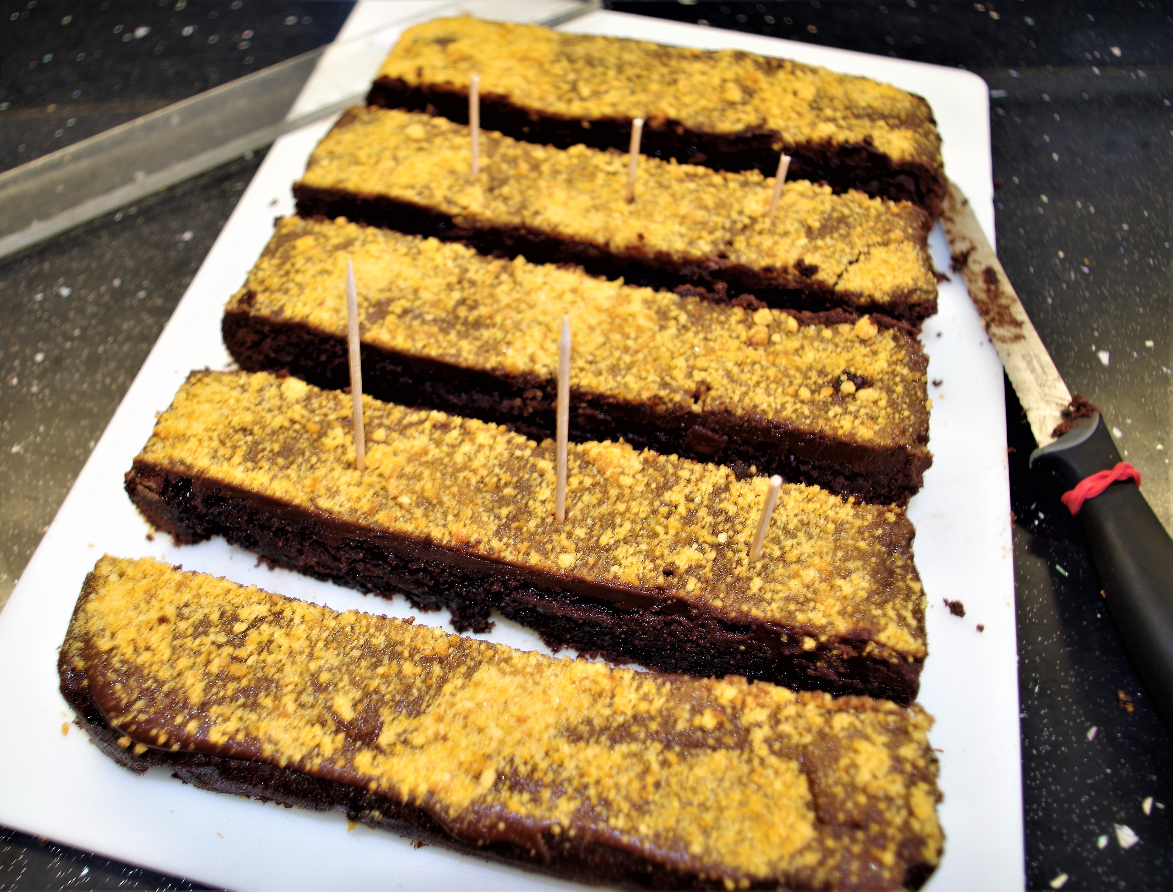 8. To decorate, melt the white chocolate and butter together in a bain marie or the microwave. Brush the tops of each brownie with melted chocolate and add the freeze dried strawberries and peanuts as desired.