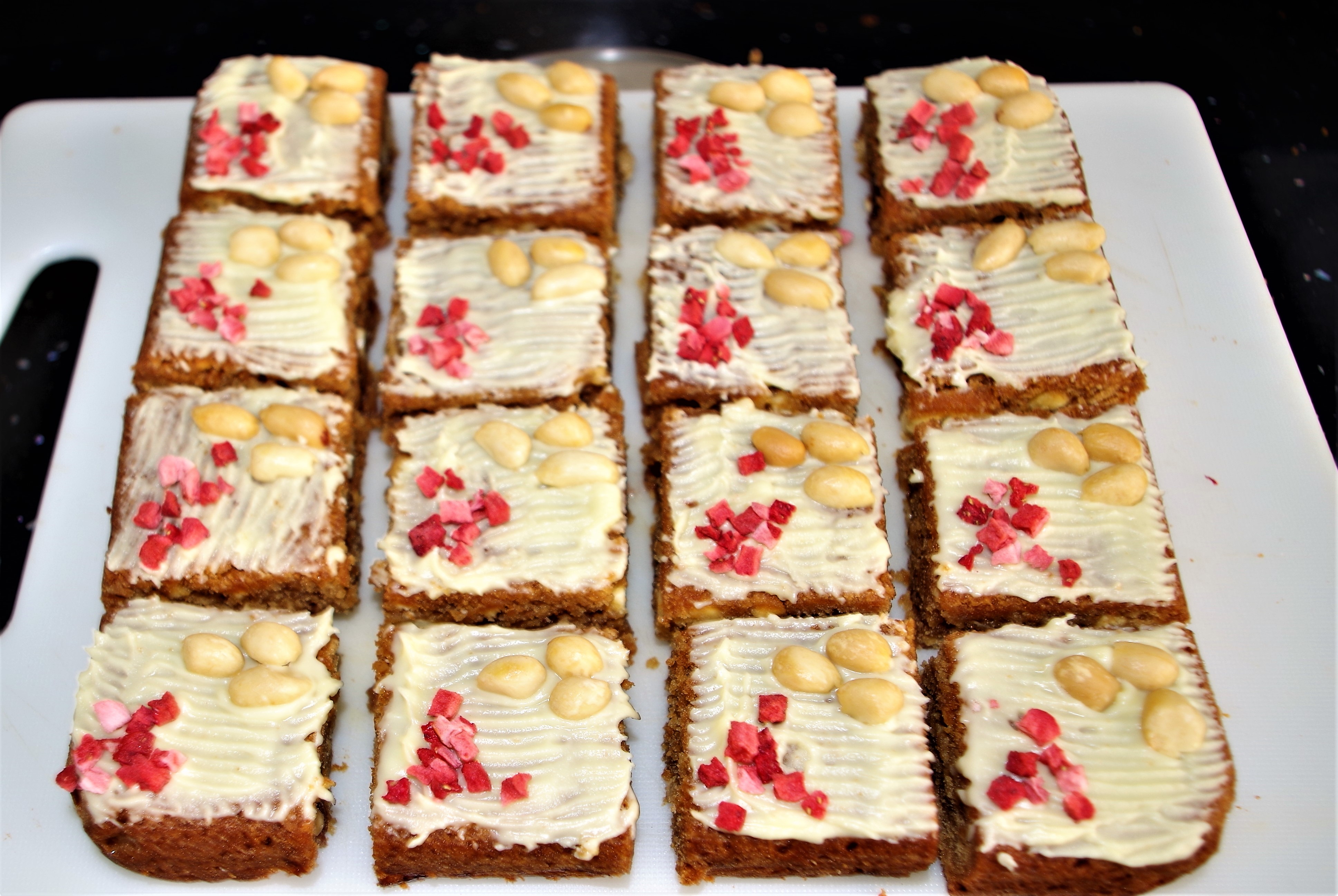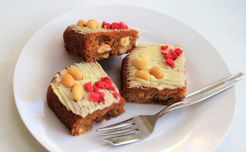 7. Remove from the oven and allow to cool in the tin, before removing and cutting into squares. (You might find the bottom surface is flatter, so invert the slab then cut it.)