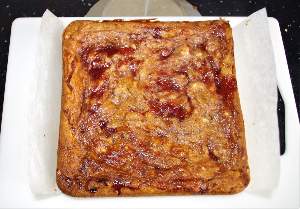 Blondies are one of my favourite tray bakes. For these I wanted to combine the richness of the white chocolate with the classic flavour combination of peanut butter and strawberry jam (or jelly in US). I’m very happy with the result and hope you will be too.