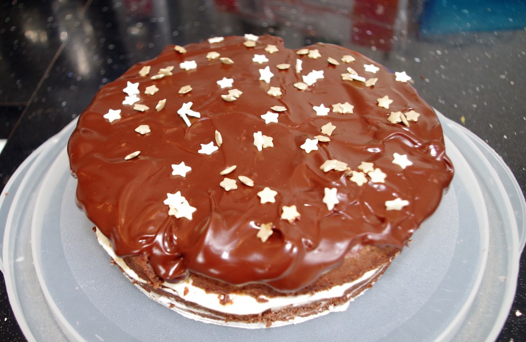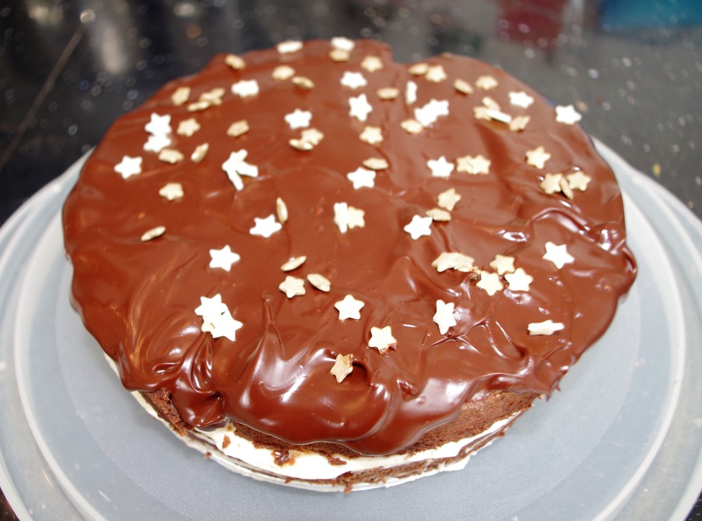 10. For the topping, melt the butter and chocolate gently in a saucepan or use a bain marie or the micro wave. Stir the mixture until it’s cool and thick, but still runny enough to pour on the cake. Pour it over and, if desired, encourage some to run down the sides.