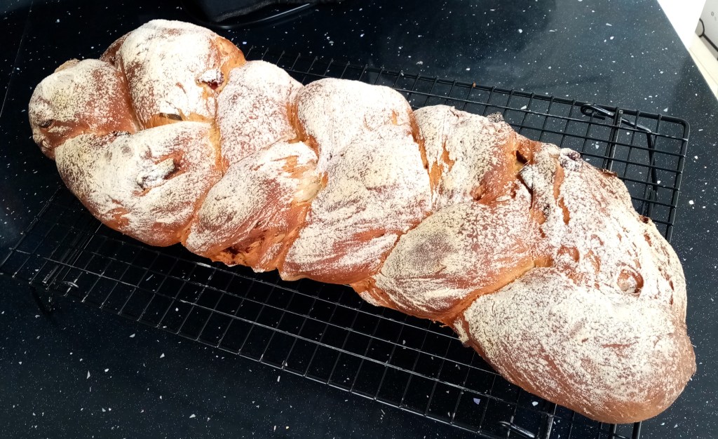 5. With the palms of your hands, roll each piece out to a sausage shaped strand about 50cm/20” long. Line them in a row on your work surface roughly parallel. Pinch the strands together at the “top/far” end then plait the strands and pinch them together at the “bottom/near” end. Tuck the ends under tidily and neaten the shape. Place onto the parchment lined baking tray. Cover or seal inside a large proving bag (i.e. a black bin liner) and leave to rise again – about 60 min.