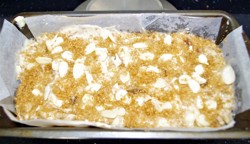 6. Lightly stir in the flour-coated plums and 50g flaked almonds then pour the mixture into the prepared loaf tin. Dot the top of the cake with the remaining flaked almonds then sprinkle over the demerara sugar. Tap the tin firmly on the work surface a couple of times to settle the mixture.
