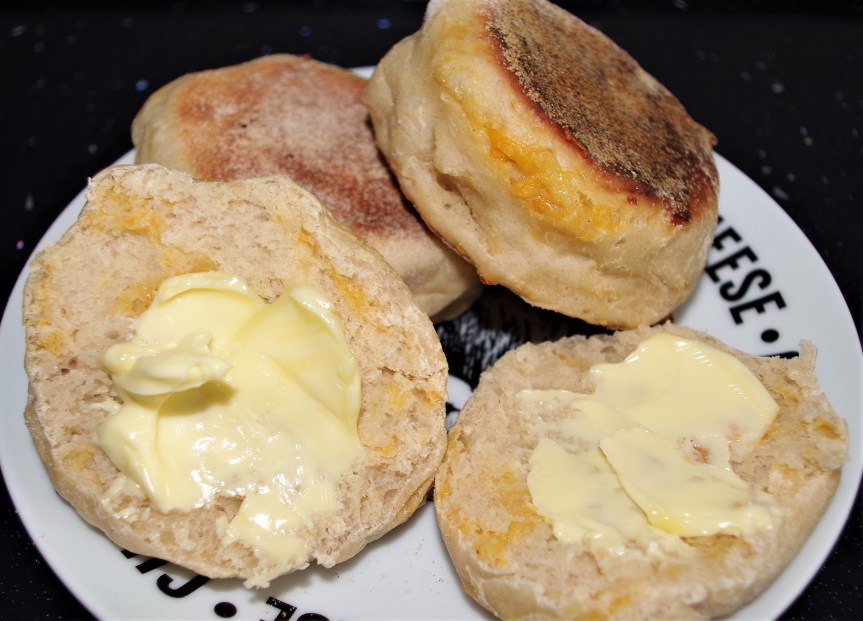 NB – Muffins should not be cut right through. The “correct” technique is to prick around the outer edge with a fork then gently prise them apart by hand. This is to ensure that the airy inner texture remains intact.