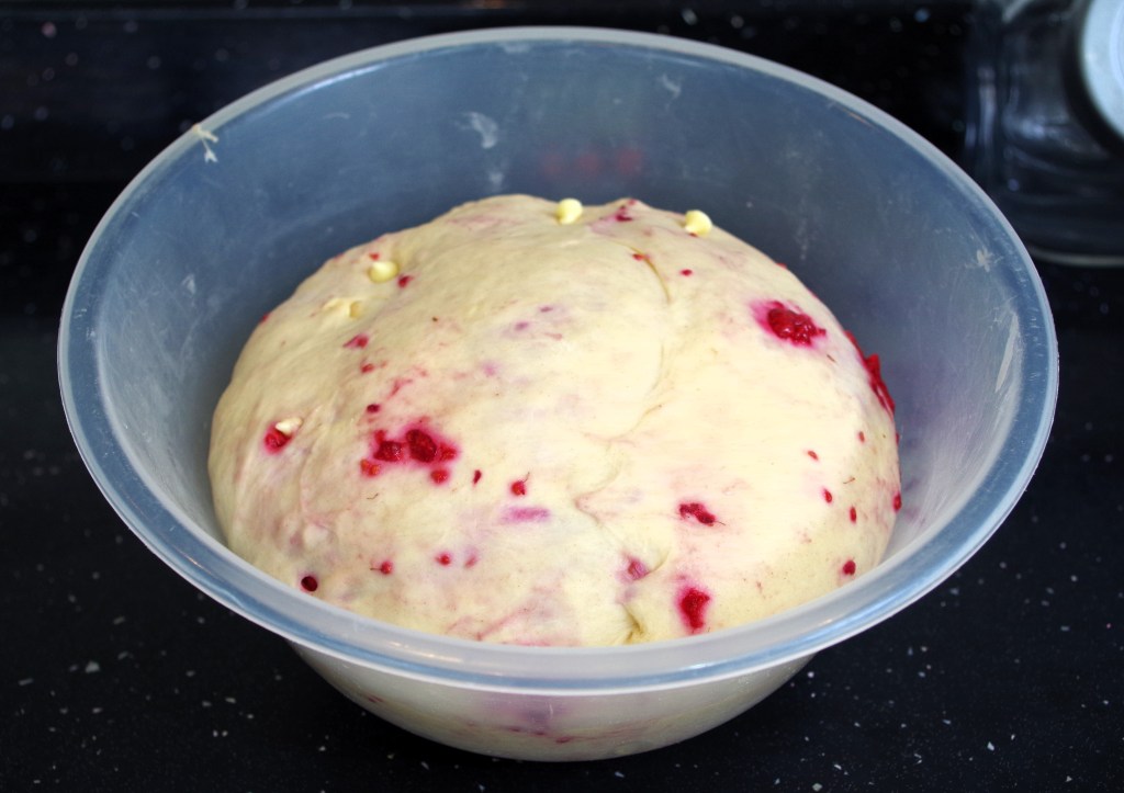 4. With the risen dough still in the bowl tip in the raspberries and white chocolate. (Or tip out the dough and roll it flat.) Gently knead the raspberries and chocolate into the dough, making sure everything is well distributed. Re-cover the bowl and leave for the dough to rise again, until doubled in size – about an hour, depending on room temperature.