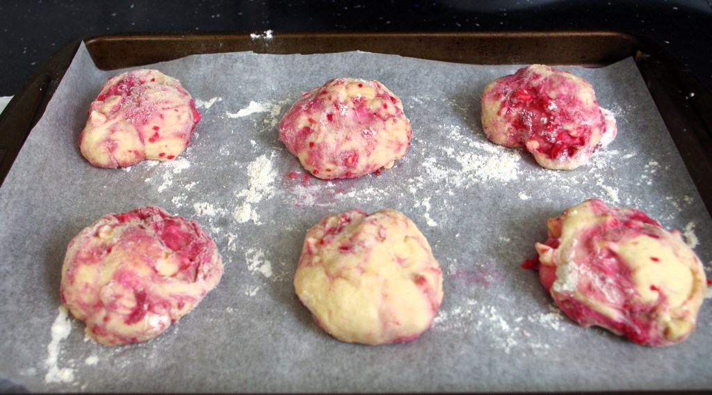 NB I found the dough incredibly wet and difficult to work with due to the moisture from the raspberries. I resorted to adding lots of flour which, to my surprise, didn’t cause any problems.