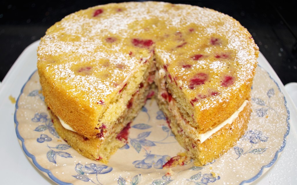 Raspberries are a tasty addition to a classic Victoria Sponge Cake.