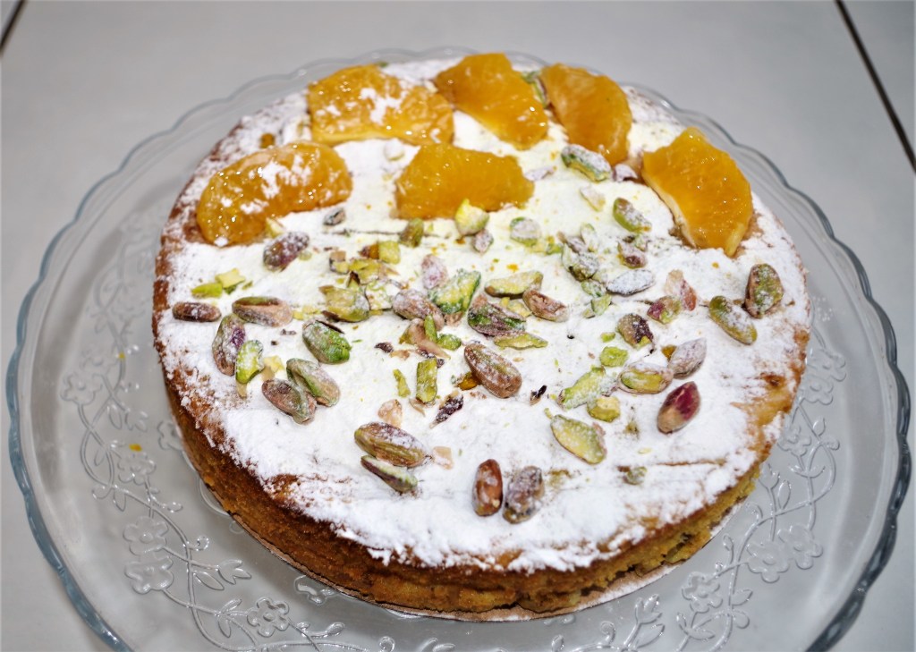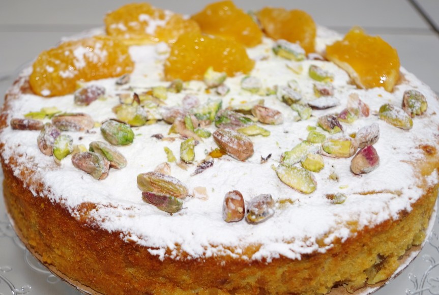7. To decorate, sprinkle the cake liberally with icing sugar and place fruit segments* and/or pistachio nuts on top – some crushed and split, some whole.