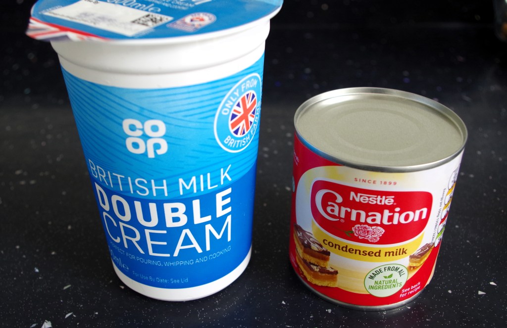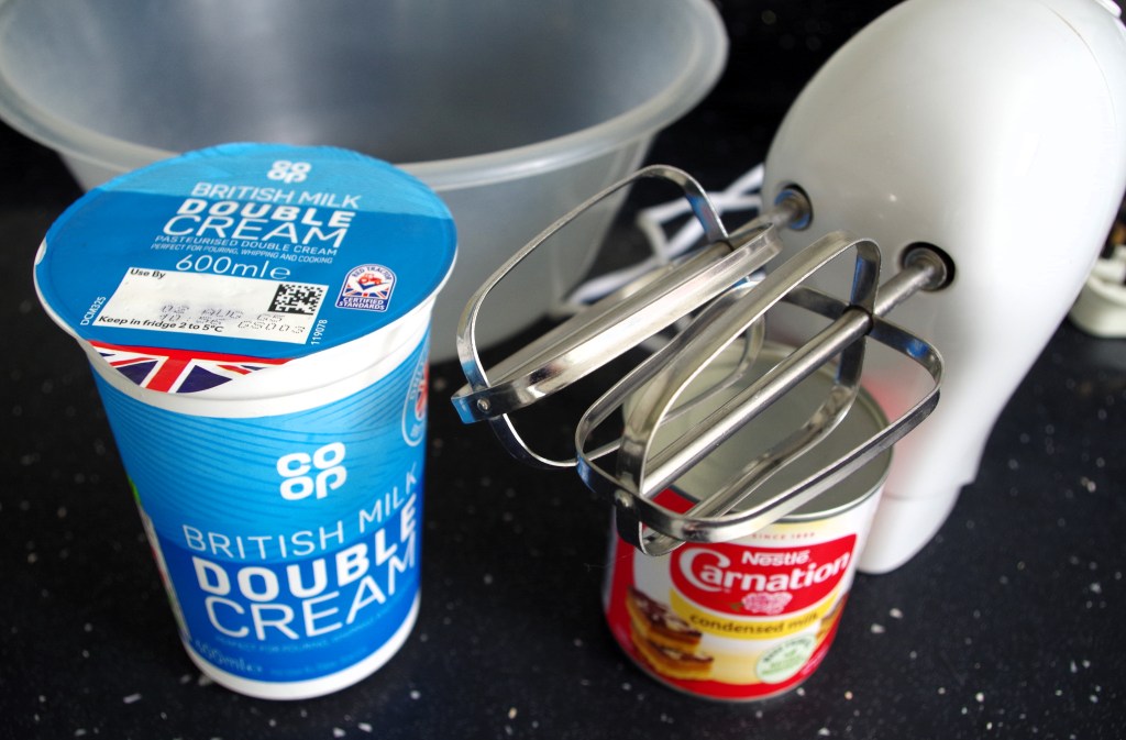 - A 500ml – 600ml tub of double cream (US – Heavy cream)