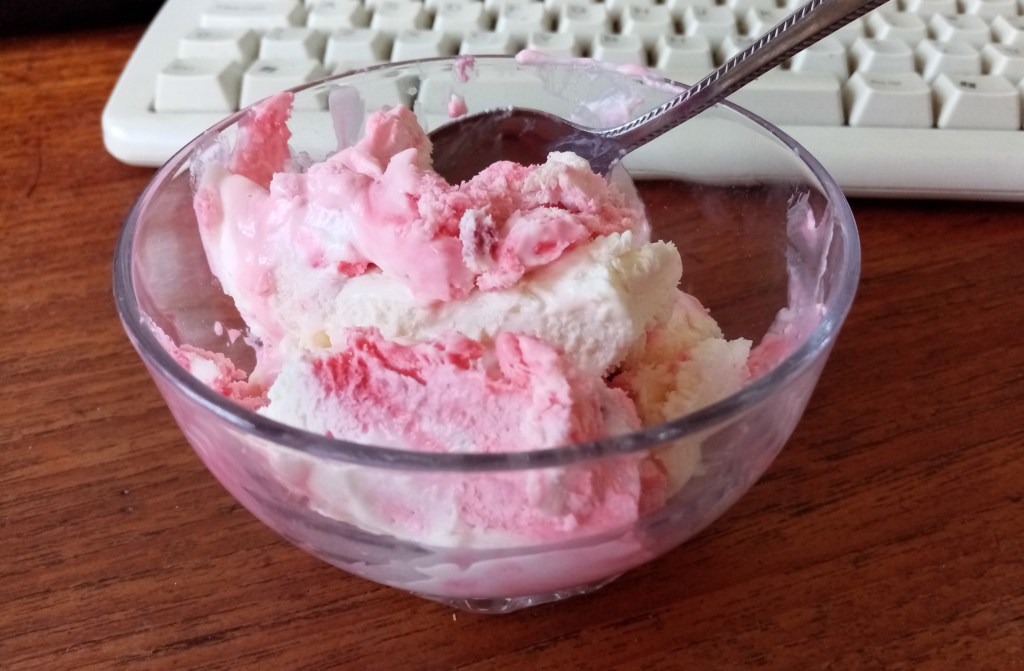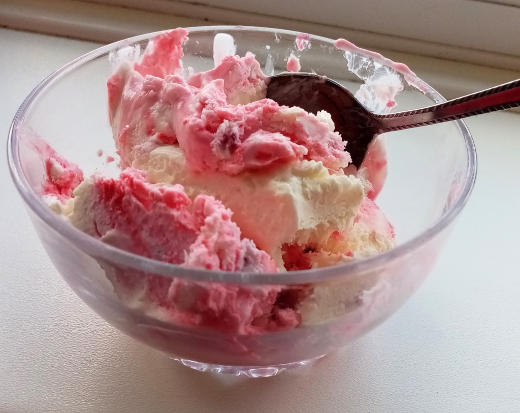To show that I can’t stop making this terrific ice cream here’s another version that “I made earlier”. As before, the base ingredients remain the same: 500g cream + tin of condensed milk. Same method too. For this one I added a blob (let’s not get too technical here) of vanilla bean paste then about 125g of glace cherries (rinsed and quartered) and about 100g of broken up chocolate bars. I wanted to use flakes, but couldn’t get any, so I used Cadbury’s Wispa bars. The end result was lovely: rich creamy ice cream + firm & chewy cherries + lots of little lumps of chocolate. I considered adding pistachios, but didn’t. I’ll leave that (for now) so that you can give it a go.