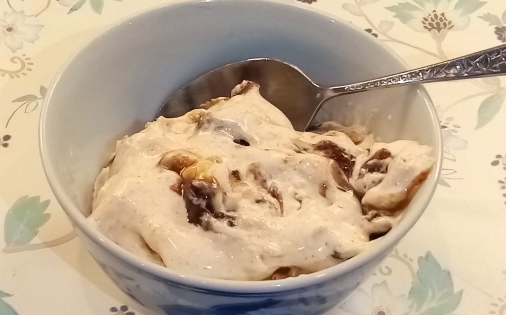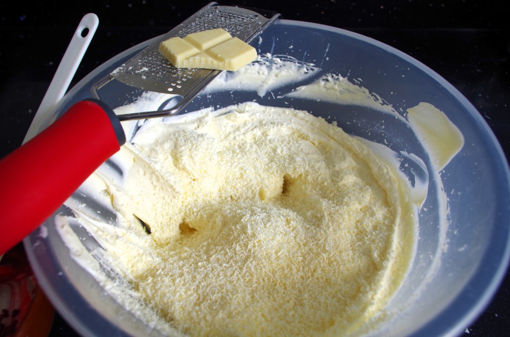 Similar to all that’s above – I whisked the cream, added the condensed milk and whisked to somewhere between soft and stiff peaks. Then I stirred in half a bag of desiccated coconut (probably about 100g) and three chopped Bounty bars. Now, as I type this, it’s in the freezer and will have set perfectly by morning. I intend serving it at our church’s Alpha meal to accompany the Banana, Chocolate & Walnut Galette that I’ll make.
