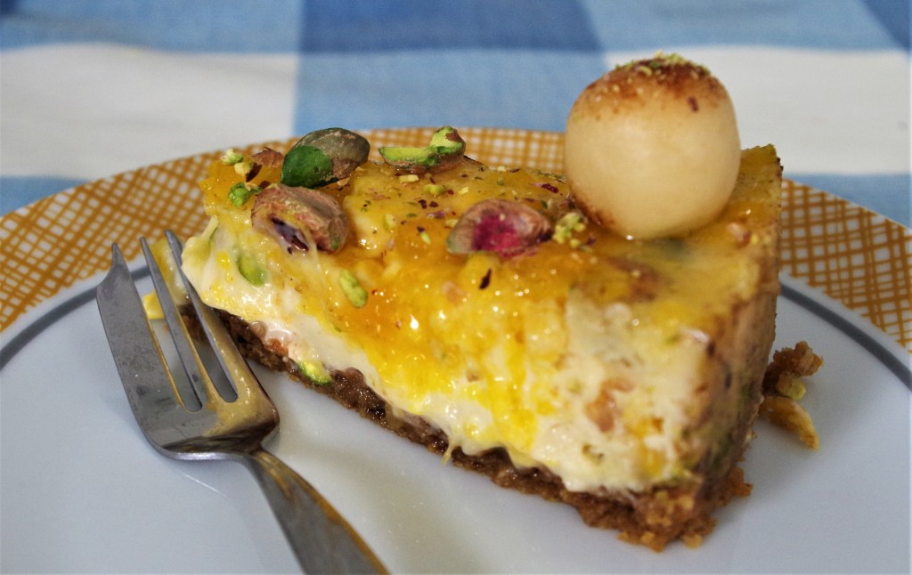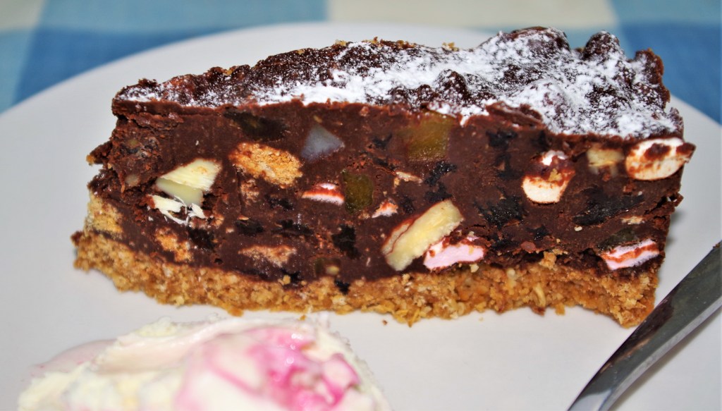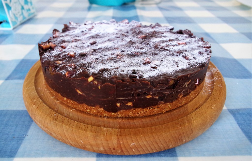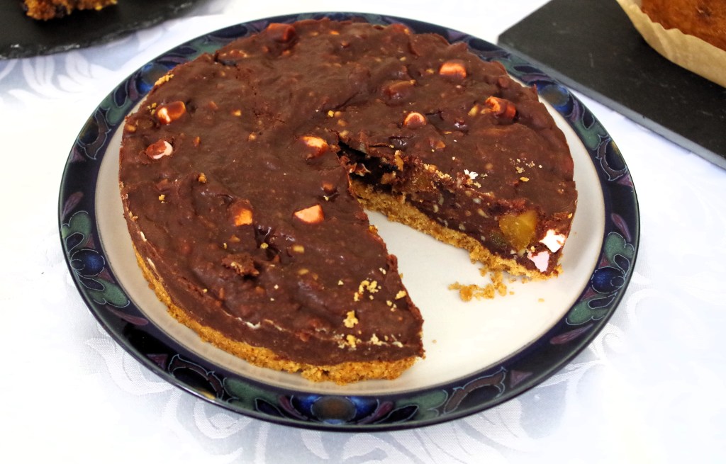 This is a wonderfully rich and luscious creation. It’s very easy to make too, as it needs no baking other than a few minutes for the base. I’m calling it a “round” because it’s a cross between a cake and a tart. (Neither “Cart” nor “Tarke” appealed to me as combination names.)