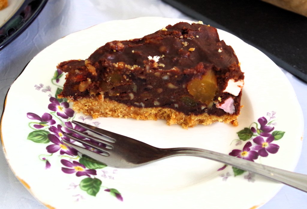 5. Pour the melted chocolate mixture into the dry mixture and stir well until everything is coated in chocolate. Tip the mixture into the tin and spread it out evenly. Use the back of a spoon or a spatula to flatten the surface. Leave it until cool* then cover with cling film and place it level in the fridge. Leave for at least 2 hours to cool and solidify. And that’s it – all done and ready to be devoured. (* If you cover it while still warm there will be condensation.)