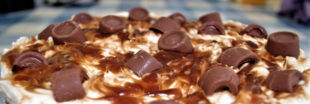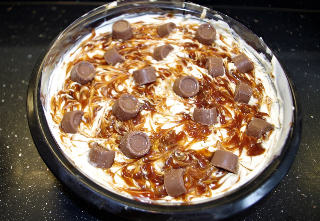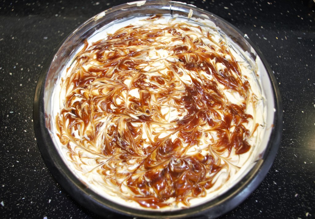 7. Spread the cheesecake mixture evenly over the biscuit base, trying not to disturb the Rolo halves. Place “blobs” of your caramel on top and swirl in using a chopstick or similar item. Place the remaining Rolos on top, either whole or halved.