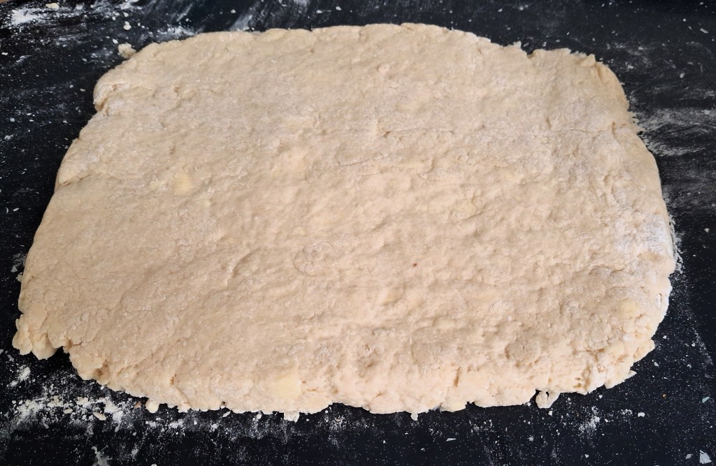 5. Tip the clump onto a lightly floured surface. Bring it together into a ball and roll out to about 15mm (½”) thickness, as rectangular as possible.