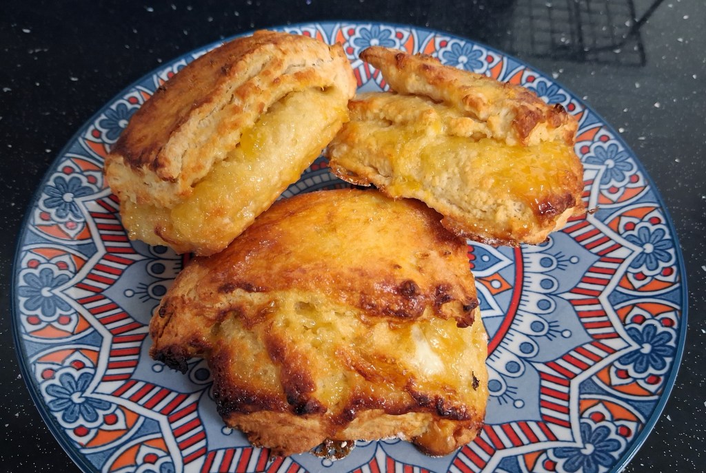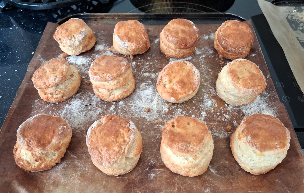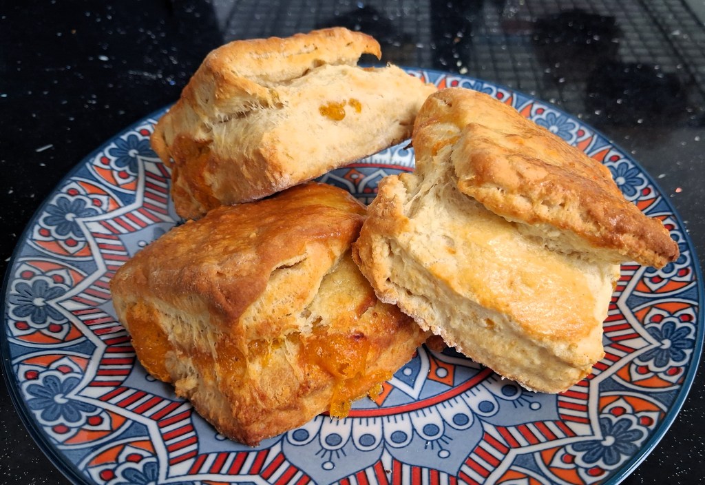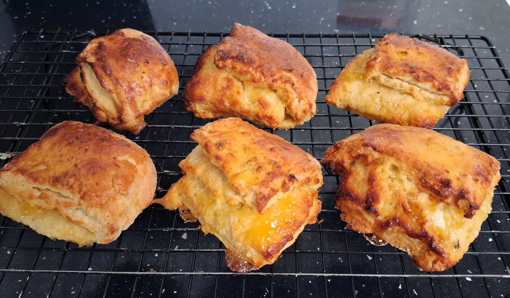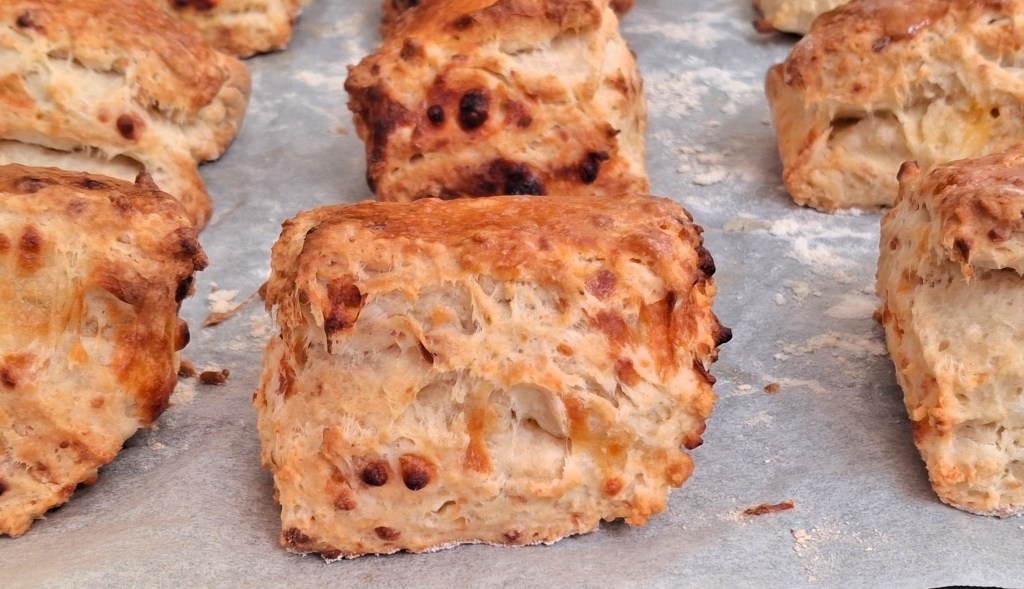 The scones shown here are something of an ongoing experiment, but don’t let that put you off. They are super already, otherwise I wouldn’t be telling you about them. Actually, I’m not sure that they should be called scones, hence the title. They’re a delicious cross between scones and puff pastry and very similar to American “biscuits”. Believe me, it works. But this is an open ended recipe, so have a go, add your own “tweeks” and flavours, enjoy the results and let me know!