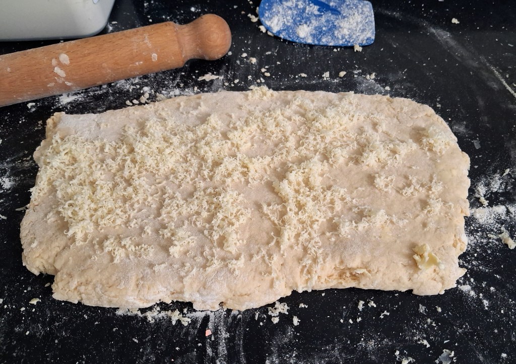 7. Roll it out again and repeat the above procedure, adding the remaining grated cheese with the grated frozen butter.