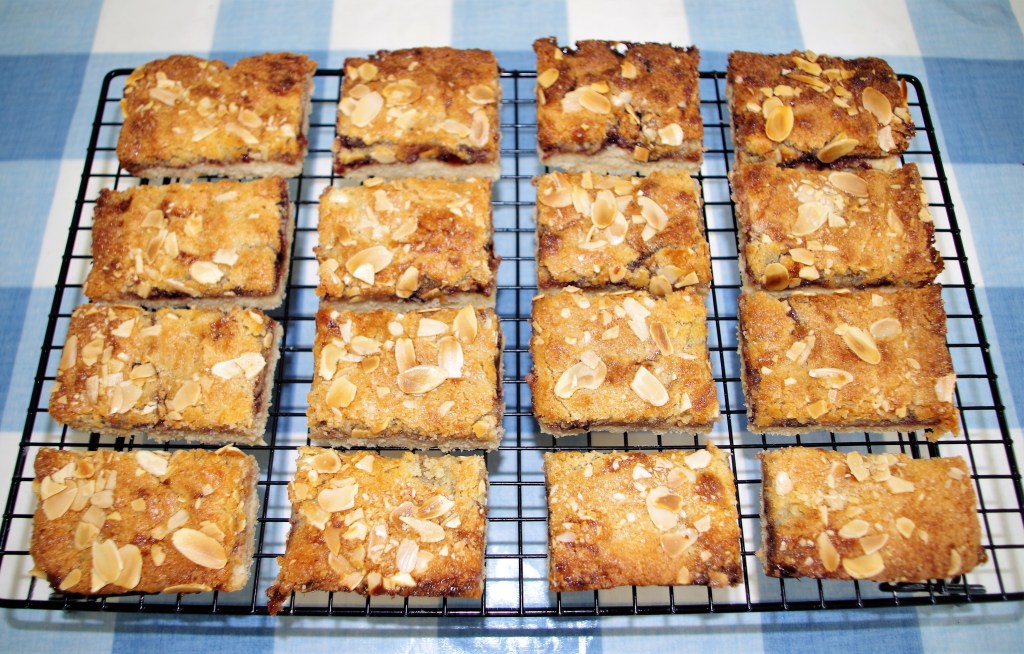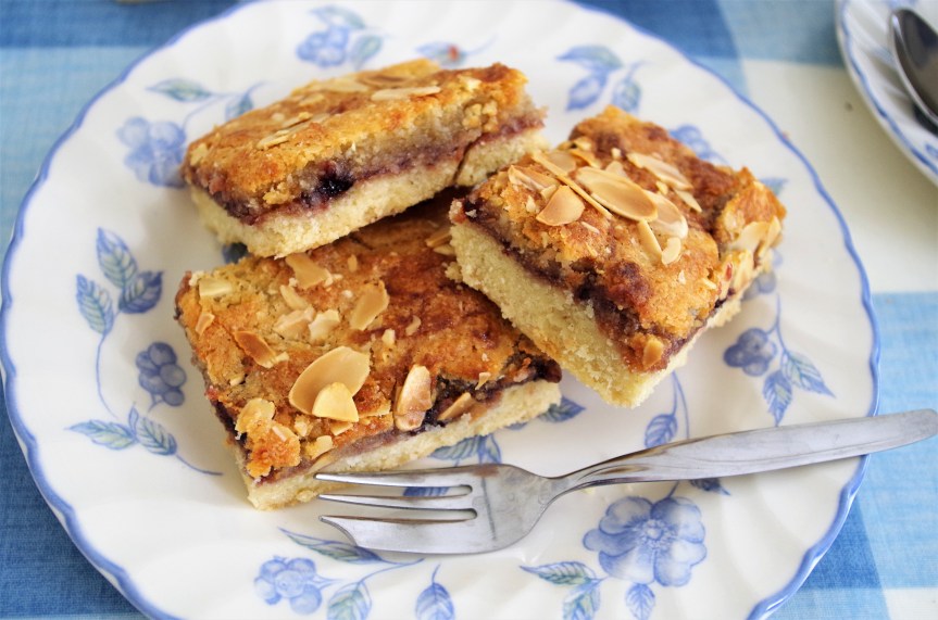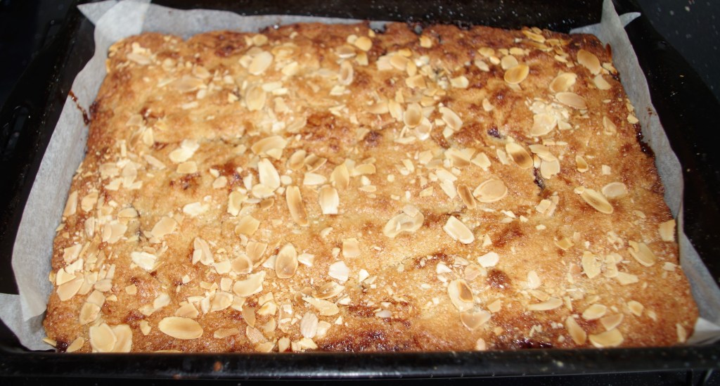 I was following a recipe for a Bakewell Tart Tray bake, but halfway through I felt that the mixture was simply not enough to fill the lined tin, so I had to improvise. Then I discovered I didn’t have a couple of the ingredients, but others instead would serve equally well and in they went.
