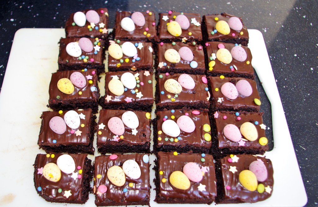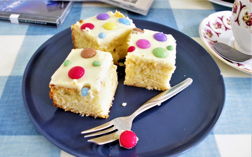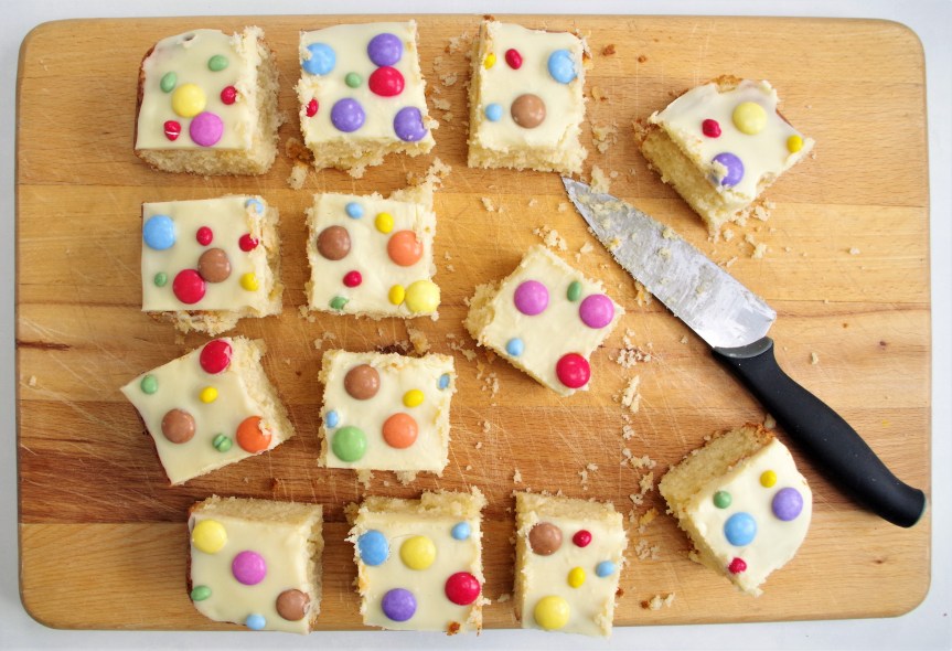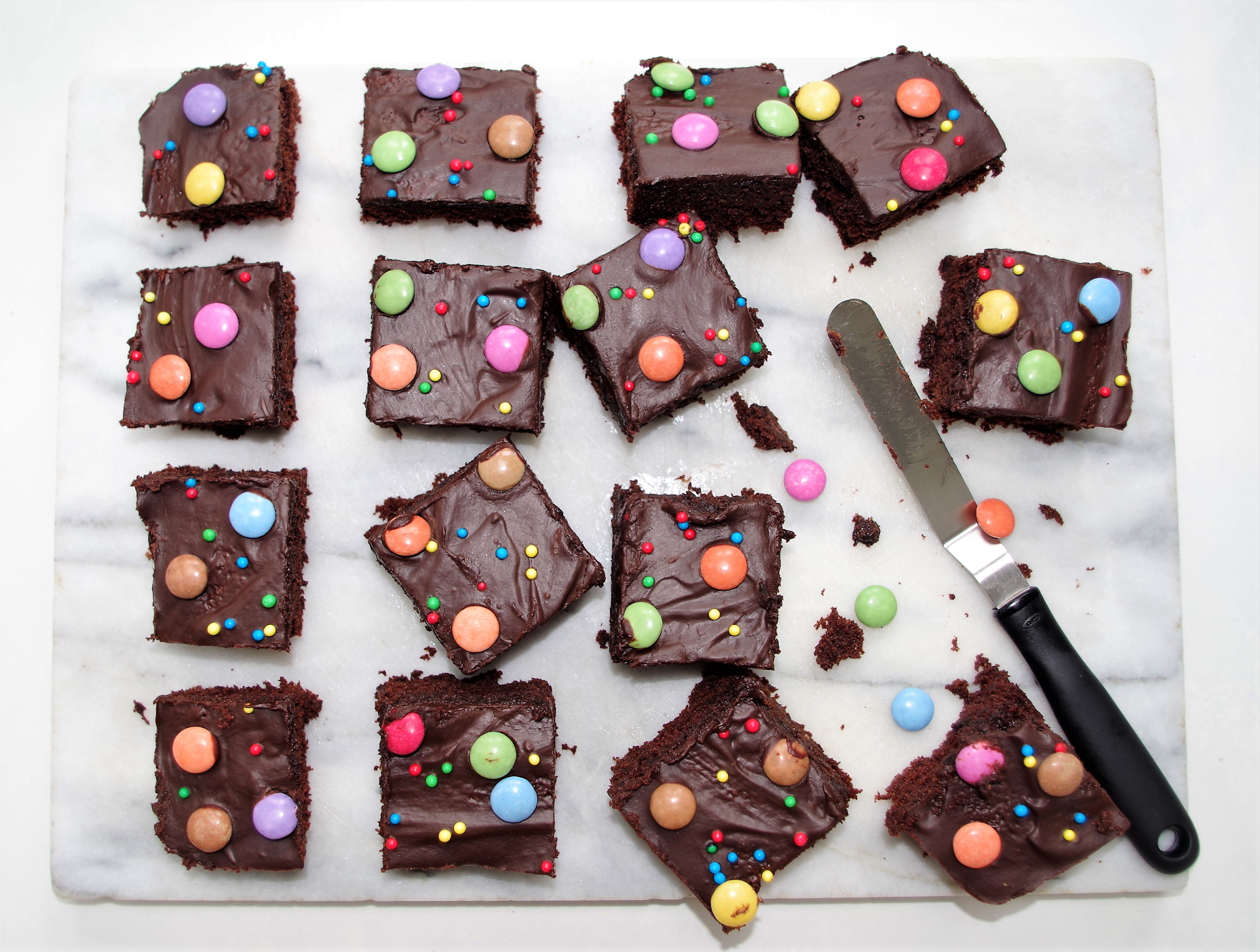 5. To make the icing, gently melt the chocolate and milk (or cream) in a bain marie, stirring as you do so. When it’s fully melted and smooth, use a palette knife or spoon to coat the surface of the cake. Scatter the top with the smarties and sprinkles and leave for 2 – 3 hours to set – could go in the fridge. Cut into pieces and serve.