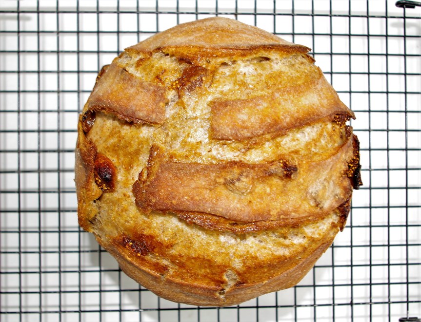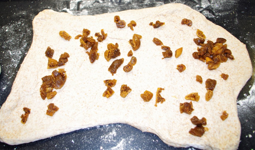 7. Flatten out the dough on a floured surface and add half the chopped figs. Fold and knead again then repeat with the rest of the figs. Form the dough into a ball.