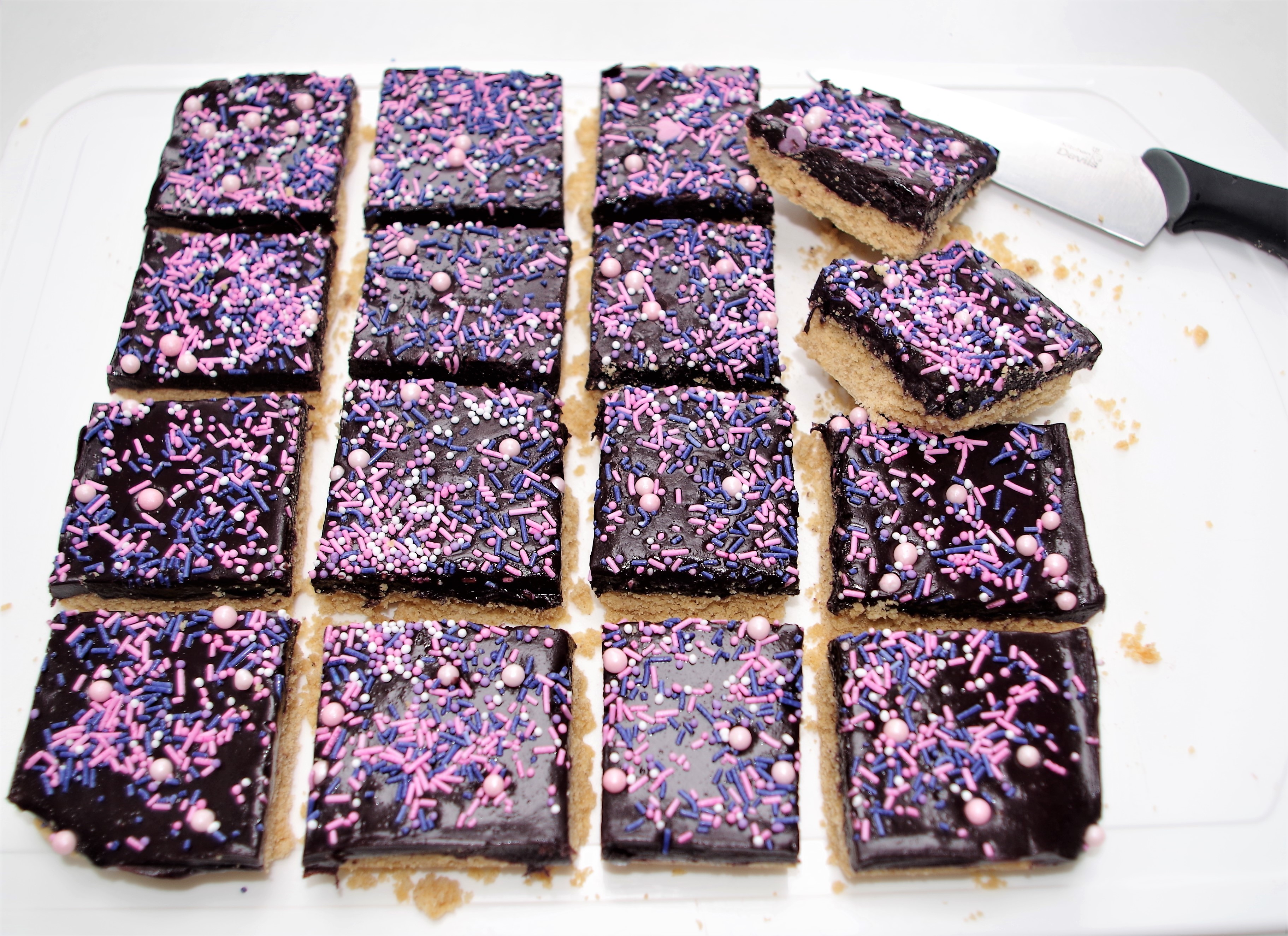 - Pour the mixture onto the cooled shortbread base. Tip the tin back and forth to ensure the mixture reaches all four corners and is spread evenly. Sprinkle your chosen sprinkles then place tin in fridge for about 2 hours to firm up.