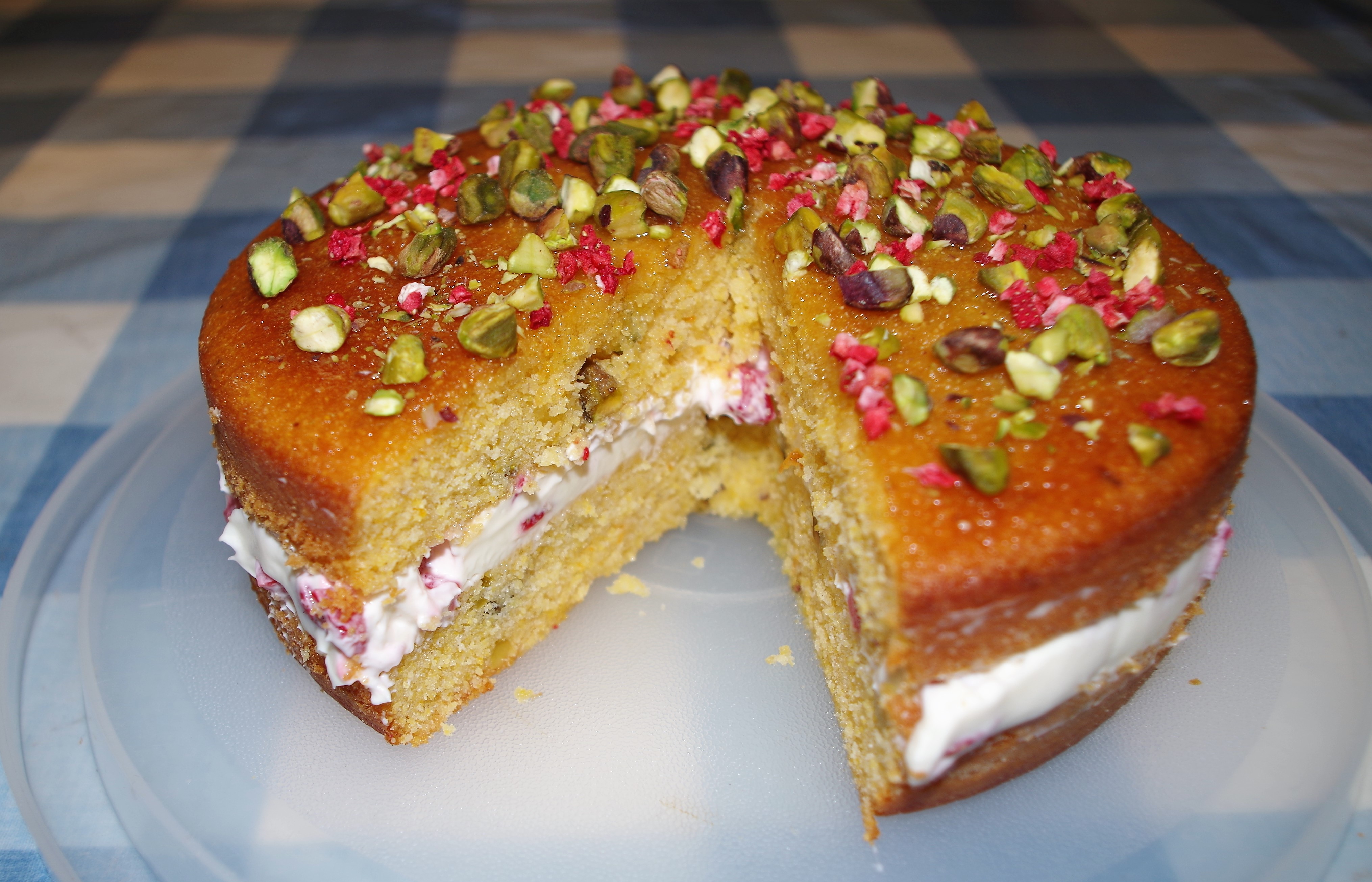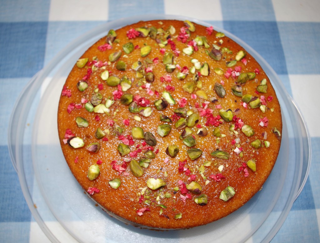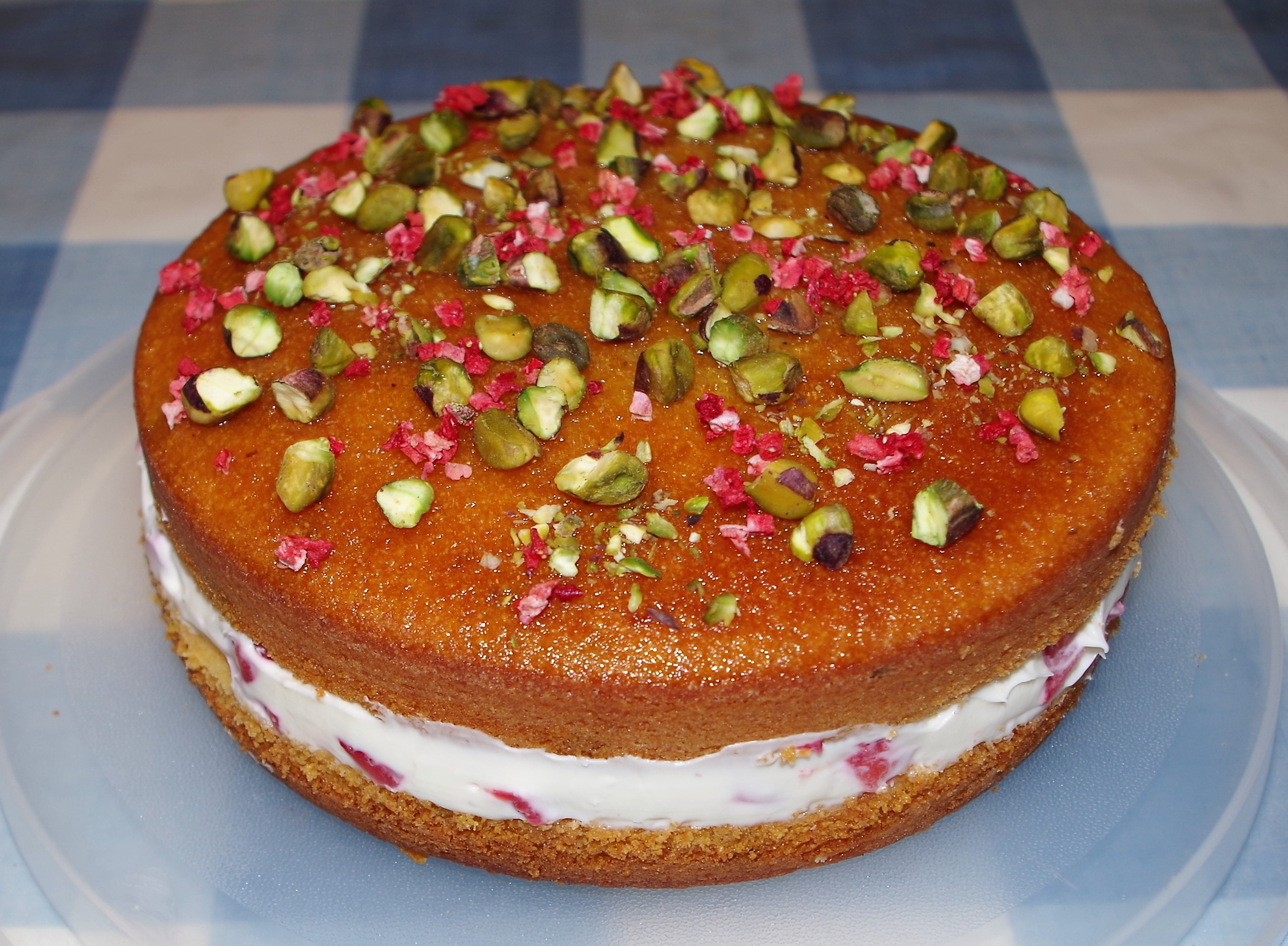7. For the topping, heat together the honey and orange juice. Allow it to cool a little then brush or pour it over the cake. Sprinkle with the chopped pistachios then add the freeze dried strawberries.