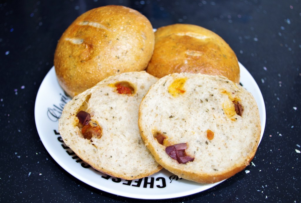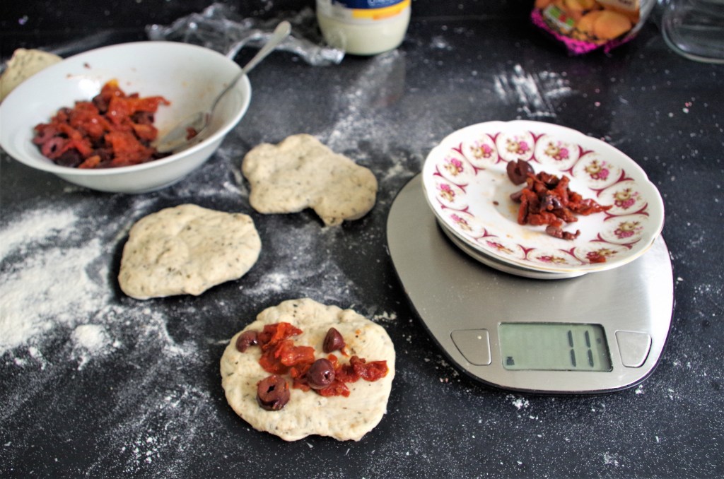 - Chop 50g/1¾oz olives, mix in with the tomatoes. Weigh the full dish and work out the weight of the contents. Divide this by 12 and that’s how much you will put in each roll before baking.