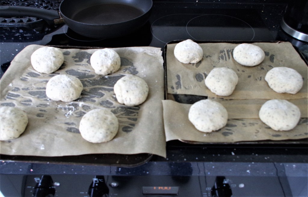 5. Put the trays inside plastic bags and leave for a second rise – 30 – 45 minutes. When almost risen, turn your oven on to 220°C / fan 200°C / 425°F / Gas 7. Put a baking stone in the oven if you have one, plus a metal dish (to hold water for some steam).