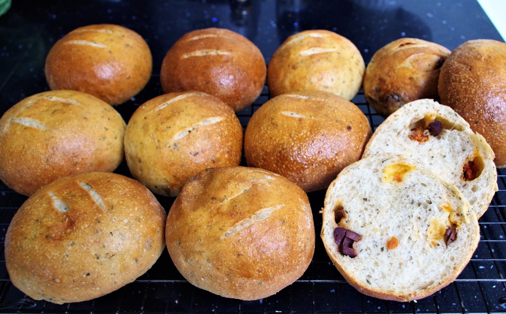 Having made several versions of my Sun-dried Tomato & Basil Bread I wanted to replicate the lovely flavour and soft texture in a batch of rolls. I was really pleased with the result, especially with the addition of olives. It also meant I could wrap them individually to give to friends, particularly those in my Italian conversation group.