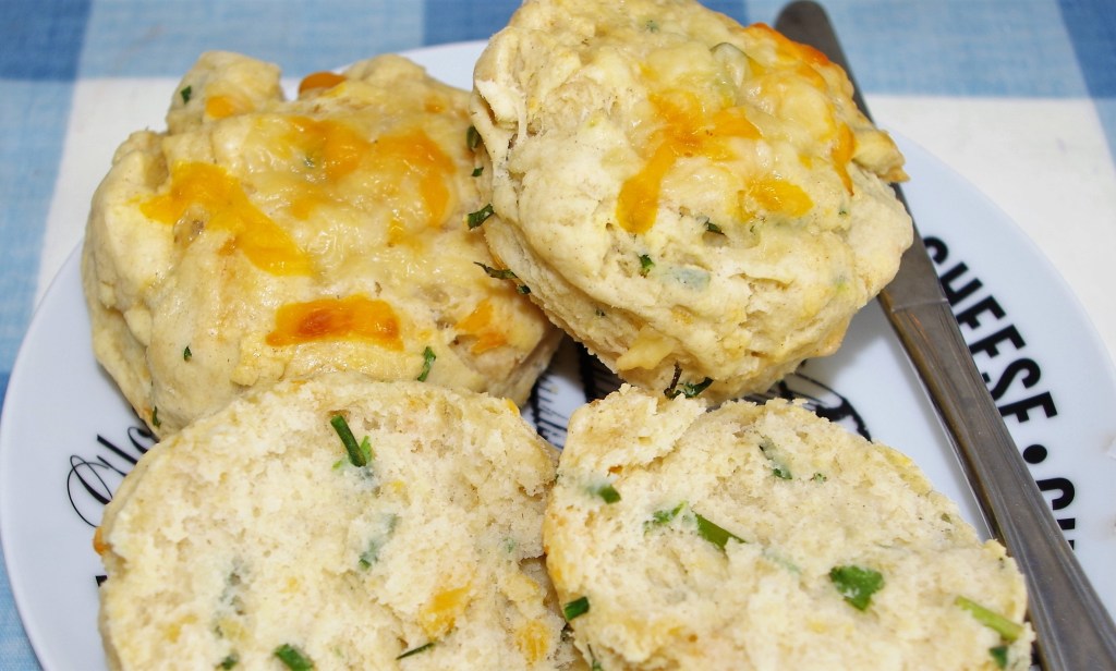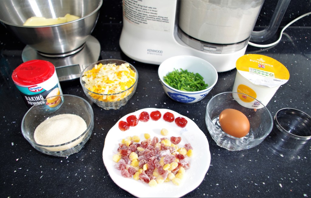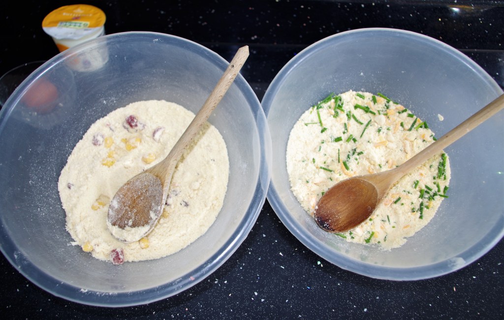 4. Into the second bowl, mix most of the cheese, the chives and the mustard powder. (Reserve some cheese to go on top of the scones.)
