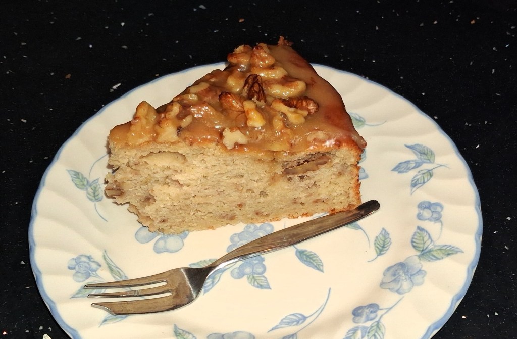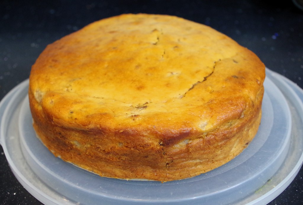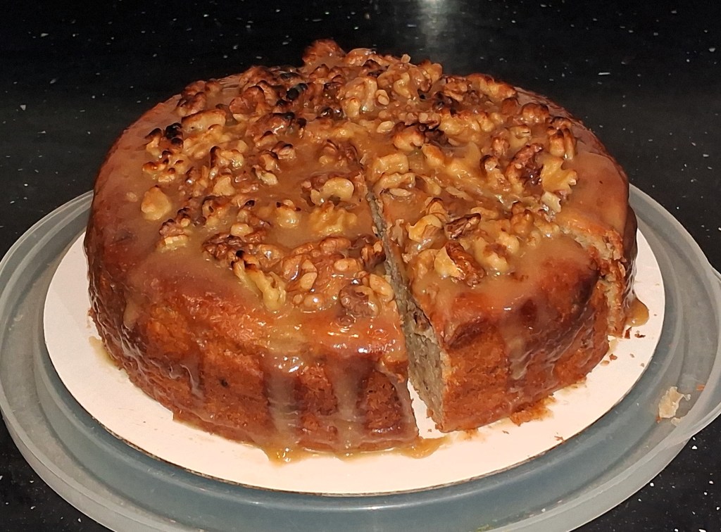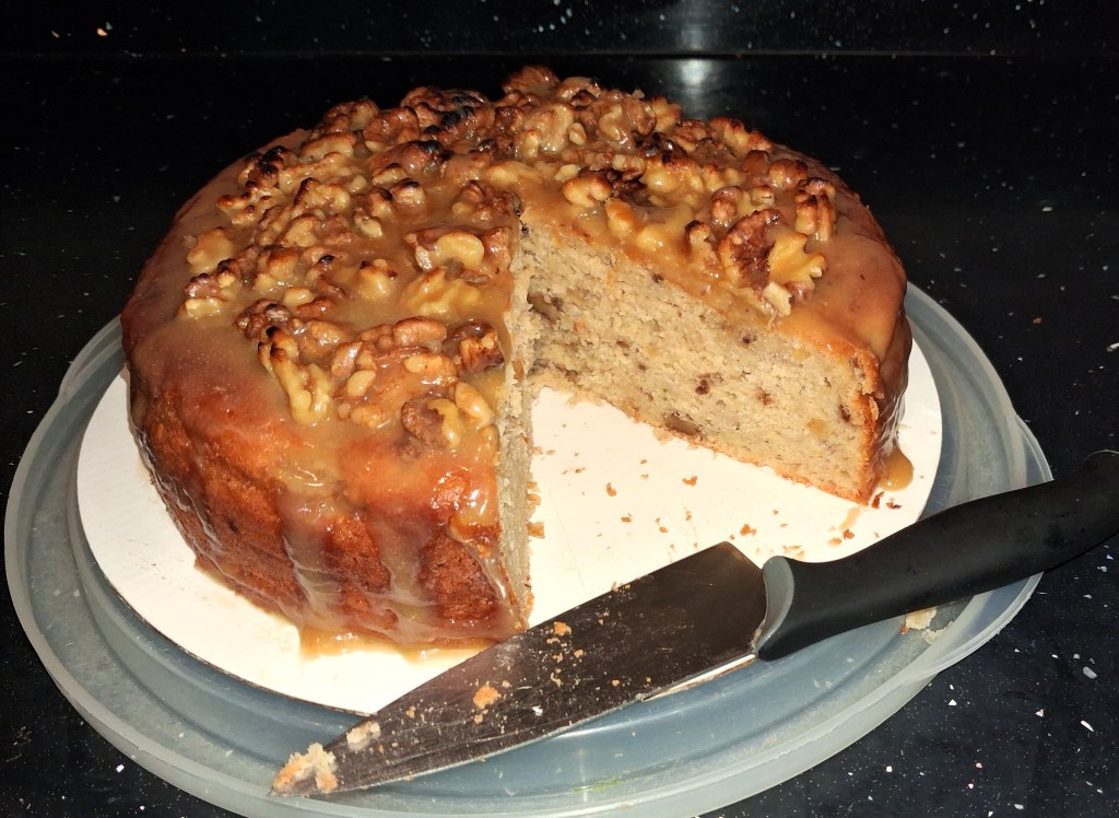 Here’s a big, impressive cake with a delicious flavour and great texture. And that’s before the fudgy, gooey, nutty topping has been added. With the topping…? Oh, yes, you definitely should try it.