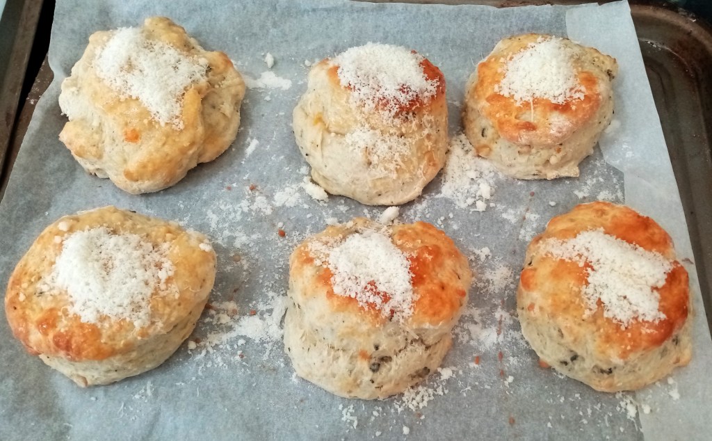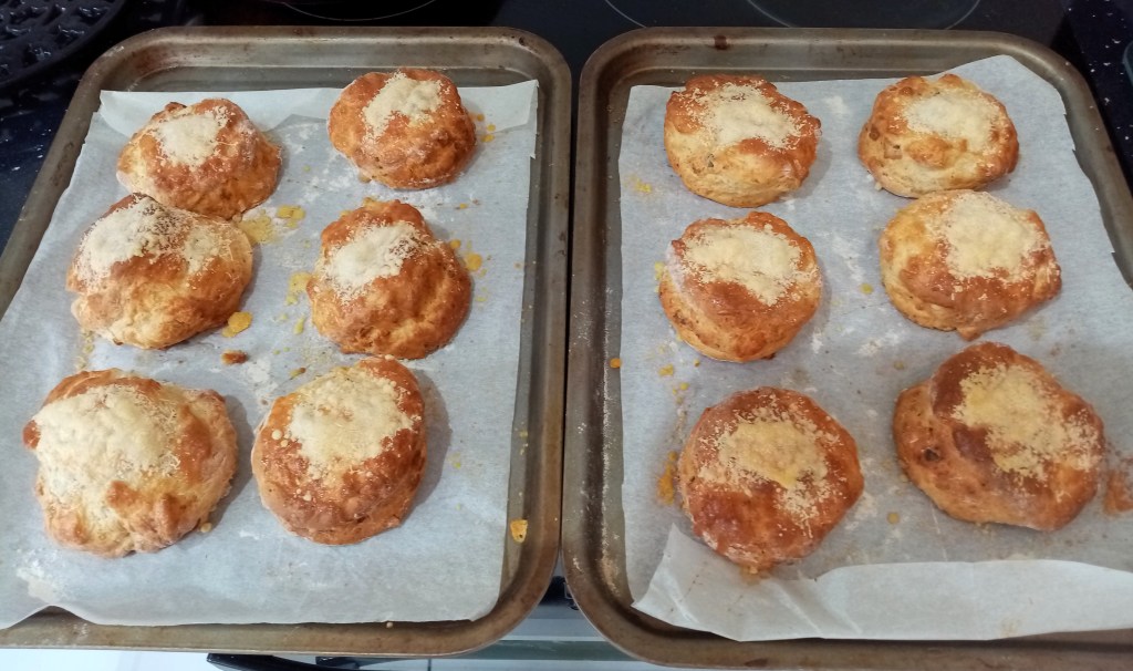 7. Bake for 9 minutes then take the trays out. Working quickly, brush scones with egg again and add a tsp of Parmesan cheese to each one. Turn the trays round and place back in the oven, swapping their shelves. Bake for about 9 – 10 more minutes.
