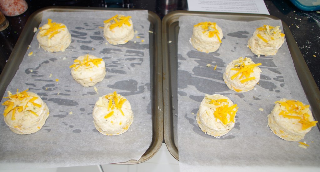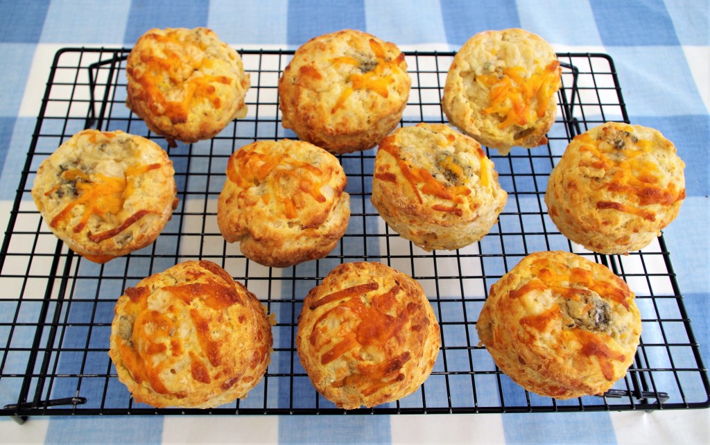 7. Brush a little milk or buttermilk over the top of each scone, trying to avoid it dribbling down the sides. Sprinkle a little of the reserved cheese onto each scone and bake for 12 – 15 minutes, until golden and/or there is a clear hollow sound when you tap them underneath.