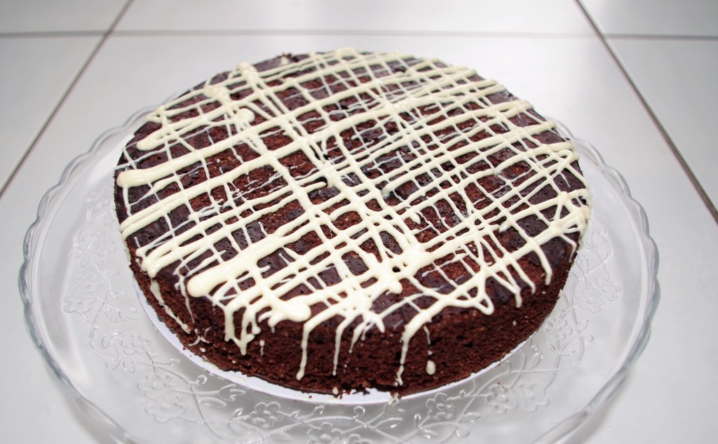5. Melt the white chocolate either using a bain marie with gentle heat or carefully in the micro-wave using short blasts and stirring each time. Allow it to cool a little and fill a piping bag. Cut a fine hole and rapidly pipe zig zag lines across the cooled cake. Return to the fridge if necessary for 30 minutes.