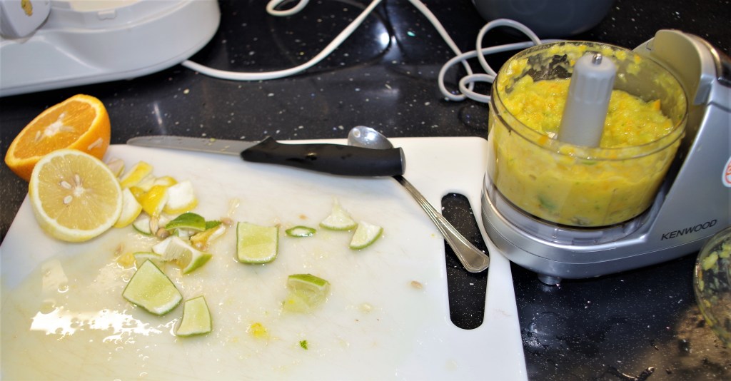 1. To make the fruit pulp, cut the lime, half lemon and half orange into small pieces, removing any pips and large pieces of white membrane. (It’s OK to use some or all of the peel.) Whizz in a food processor with the sugar until they become a pulp. You need about 200g – 250g of pulp, 7oz – 9oz. Set aside to use later.