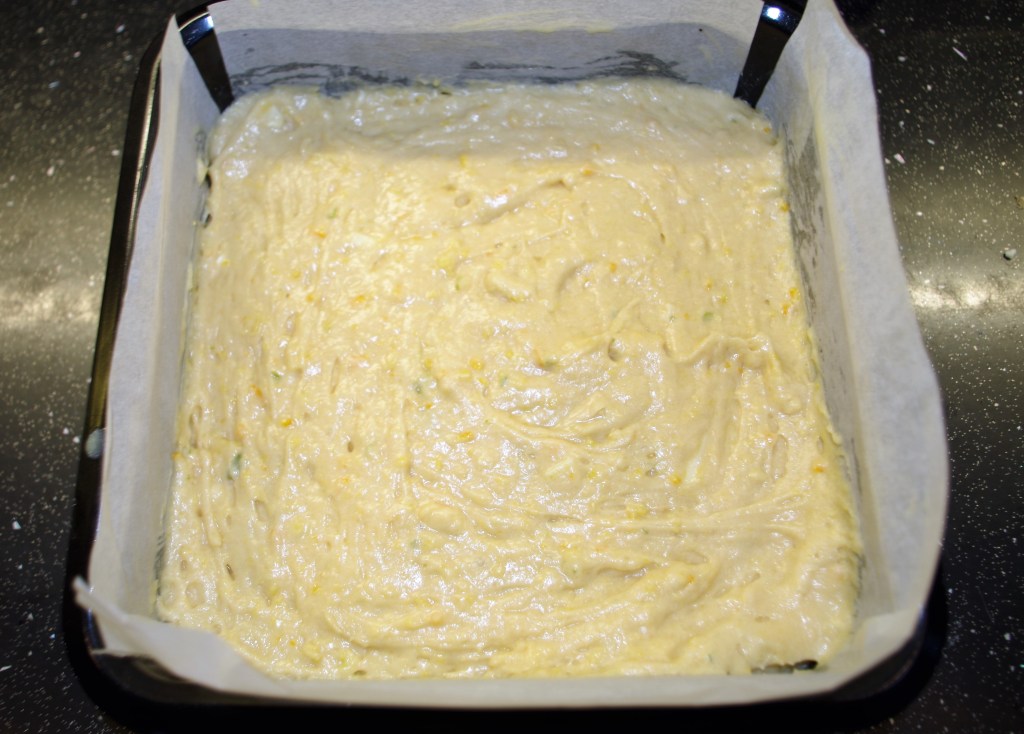 8. Pour the mixture into the tin, smoothing it into the corners. Tap the tin on your work surface to settle the mixture.